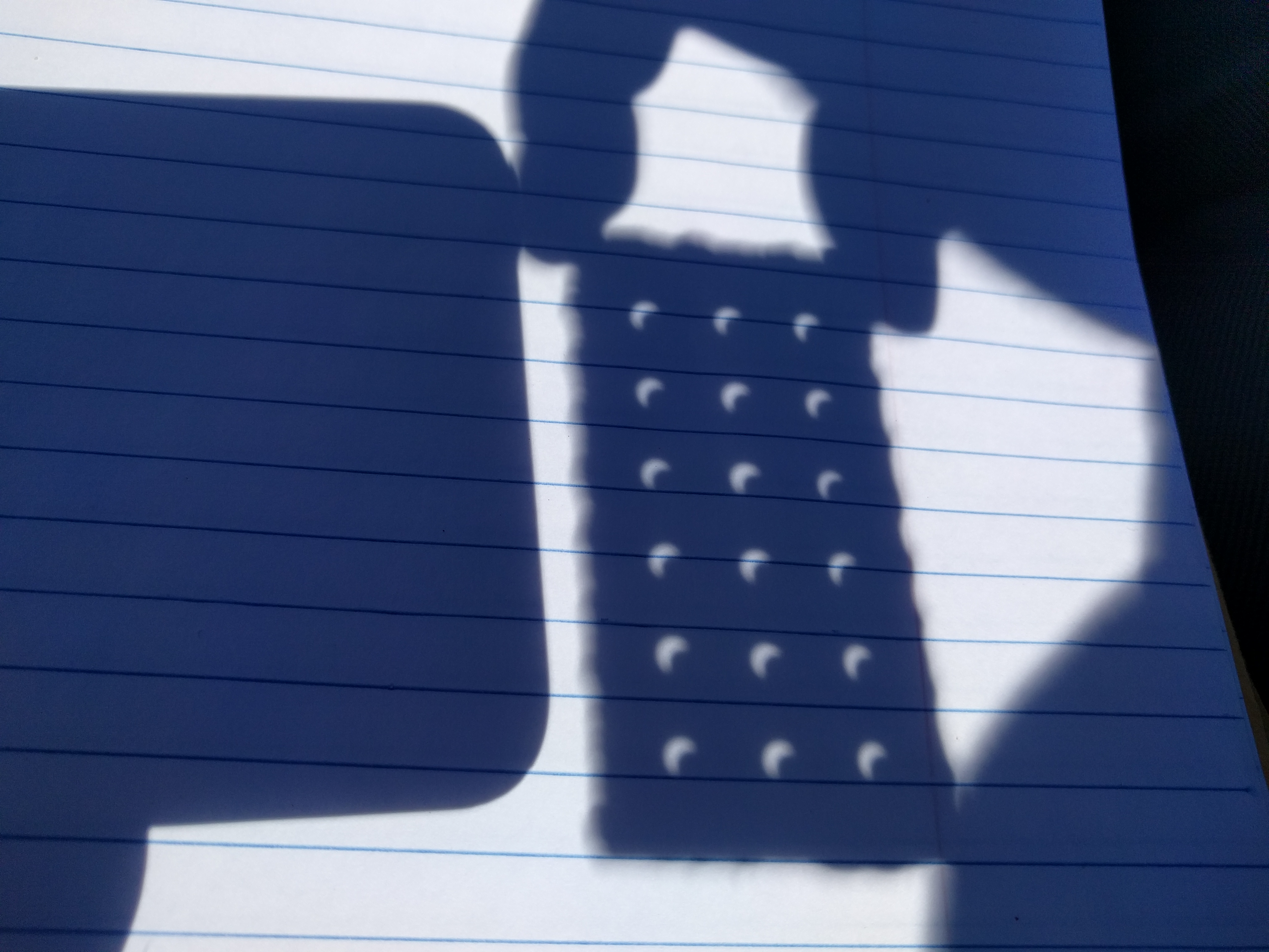 Pinhole cameras allow folks to view a projection of the sun with the naked eye. If you have a box of club crackers around, you've got a perfectly fine box of edible pinhole cameras! Just hold it up away from your bright surface (here, a notebook), and adjust the height until your eclipse shape is achieved. It's quite mesmerizing how moving the cracker around doesn't change the projected sun shape.